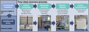 The research group at Fraunhofer Institute for Chemical Technology ICT explored a simple, highly scalable method for Li2CO3 recovery using a combination of several methods like ion exchange (IE), reversed osmosis (RO), electrodialysis with bipolar membranes (EDBM), and Li2CO3-precipitation (see figure below). The goal was to recover high-purity lithium carbonate from Lithium-concentrated solutions provided by partners EnBW and KIT.